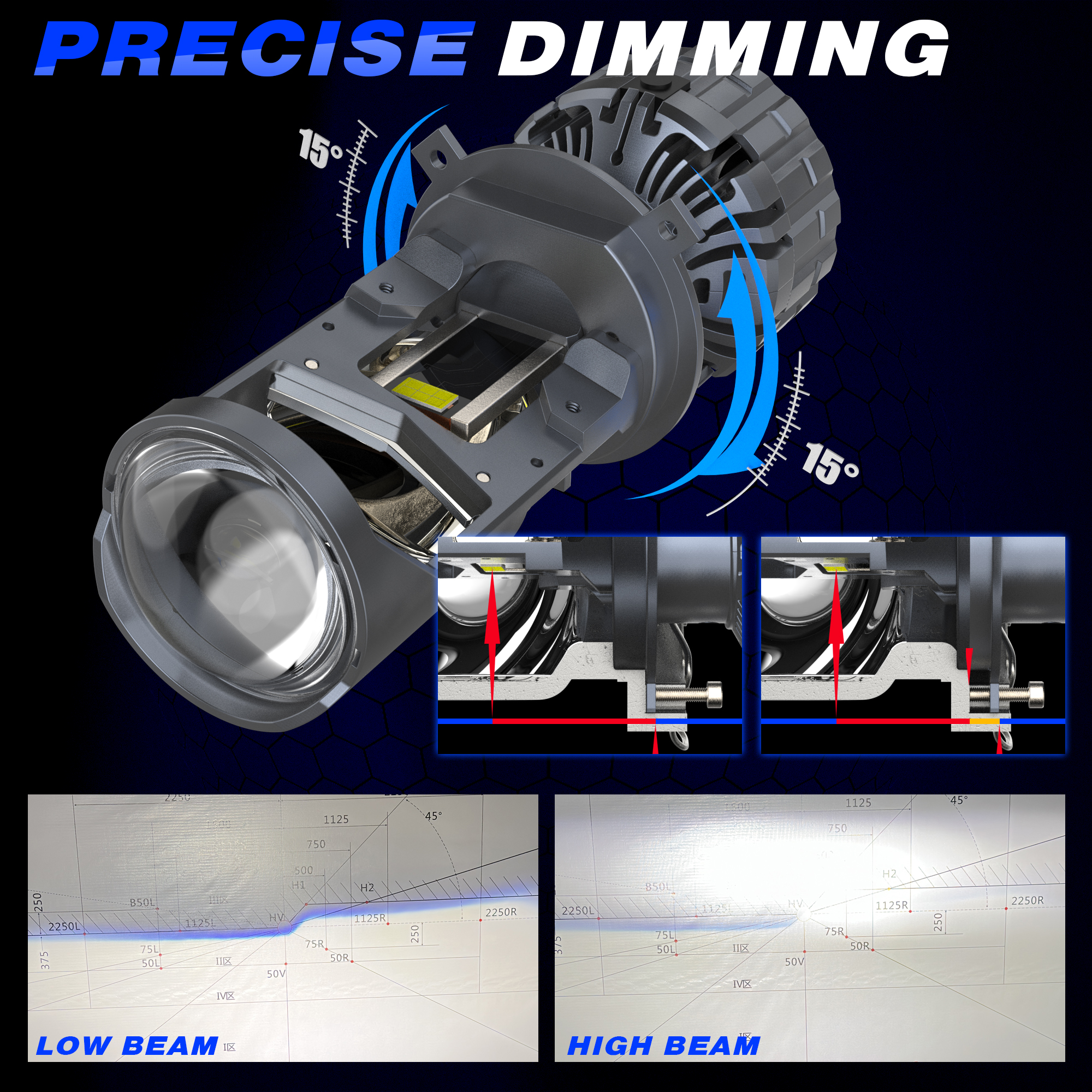 1. Lens + main light, split disassembly and assembly structure (unique in the industry) 2. 70W full brightness (highest in the industry) 3. New layout of lamp bead sequence and lens, better light pattern, no shadows